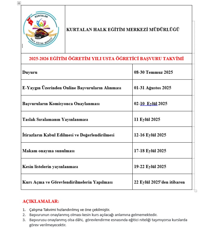 2025-2026 Eğitim Öğretim dönemi Kurtalan Halk Eğitimi Merkezi Müdürlüğümüze bağlı açılacak kurs faaliyetleri için Ücretli Usta Öğretici Görevlendirme başvurusunda bulunanlara ait Taslak Sıralama Listesi yayınlanmıştır.